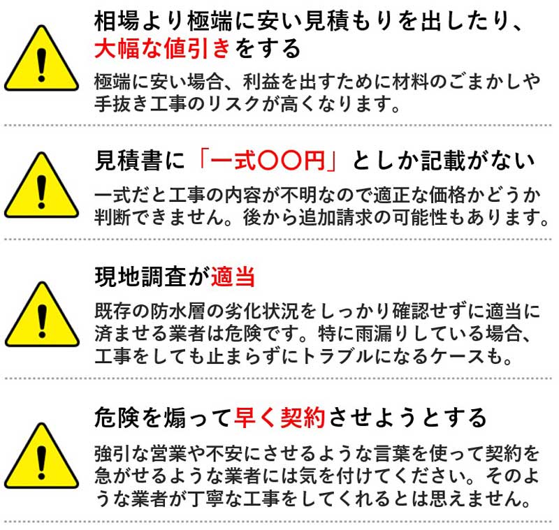 建設会社・工務店などを介さない、防水業者さんの直接施工のため、無駄な中間マージンが発生しません。