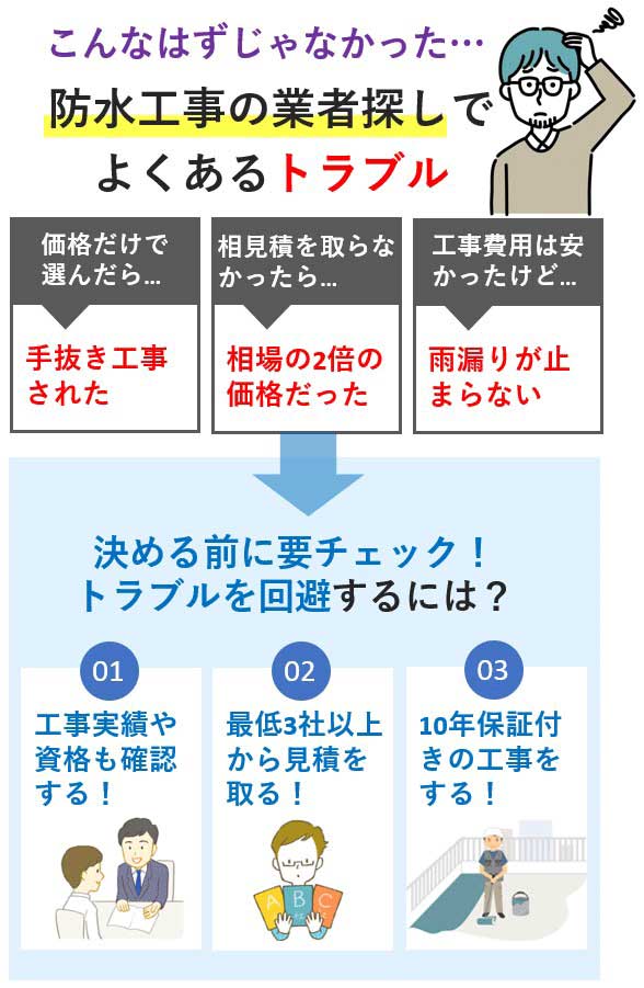 防水工事は業者による技術と経験の差が大きな業界で、トラブルも多い業界だということが分かりました。
