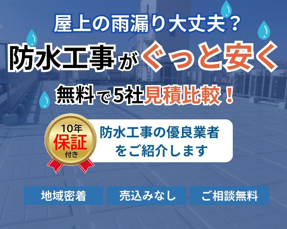 日本全国の優良な防水業者さんを無料で5社までご紹介。防水工事のご相談から工事完了までお施主様をフルサポートします。